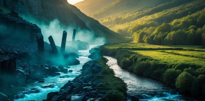 Gränsen framställs ofta som en geografisk barriär — floder, dimhöljda marker eller en frosttung dal som skiljer Midgård från Helheim.